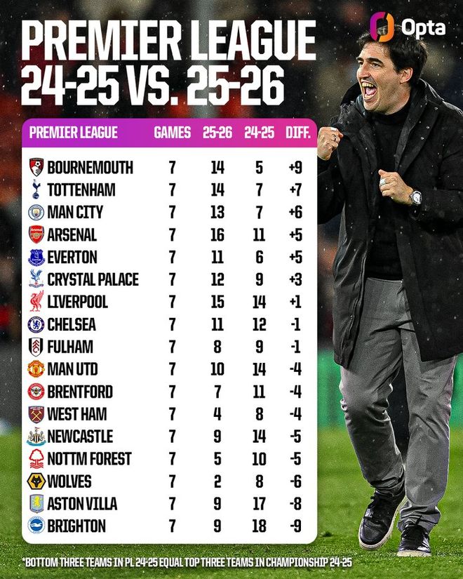 同上个赛季同期相比,伯恩茅斯的积分要高出9分,也是上升幅度最大的球队;热刺也脱胎换骨,要会高出7分,曼城高出6分,阿森纳和埃弗顿高出5分,水晶宫高出3分,利物浦高出1分。