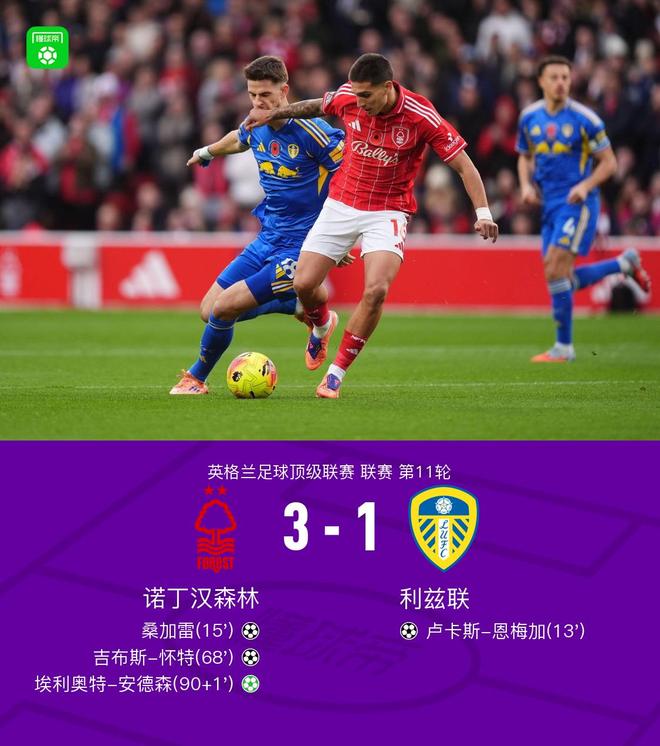 北京时间11月9日,英格兰足球超级联赛第11轮,诺丁汉森林坐镇主场迎战利兹联。比赛开局阶段,利兹联通过一次快速进攻取得领先,阿伦森送出助攻,卢卡斯-恩梅加破门。仅两分钟后,诺丁汉森林迅速还以颜色,桑加雷将比分扳平。易边再战,诺丁汉森林持续加强攻势,第68分钟,奥马里-哈钦森突破后送出关键传球,吉布斯-怀特头球破门帮助球队反超比分。进入补时阶段,埃利奥特-安德森点球稳稳命中,锁定胜局。最终,诺丁汉森林以3比1逆转战胜利兹联。